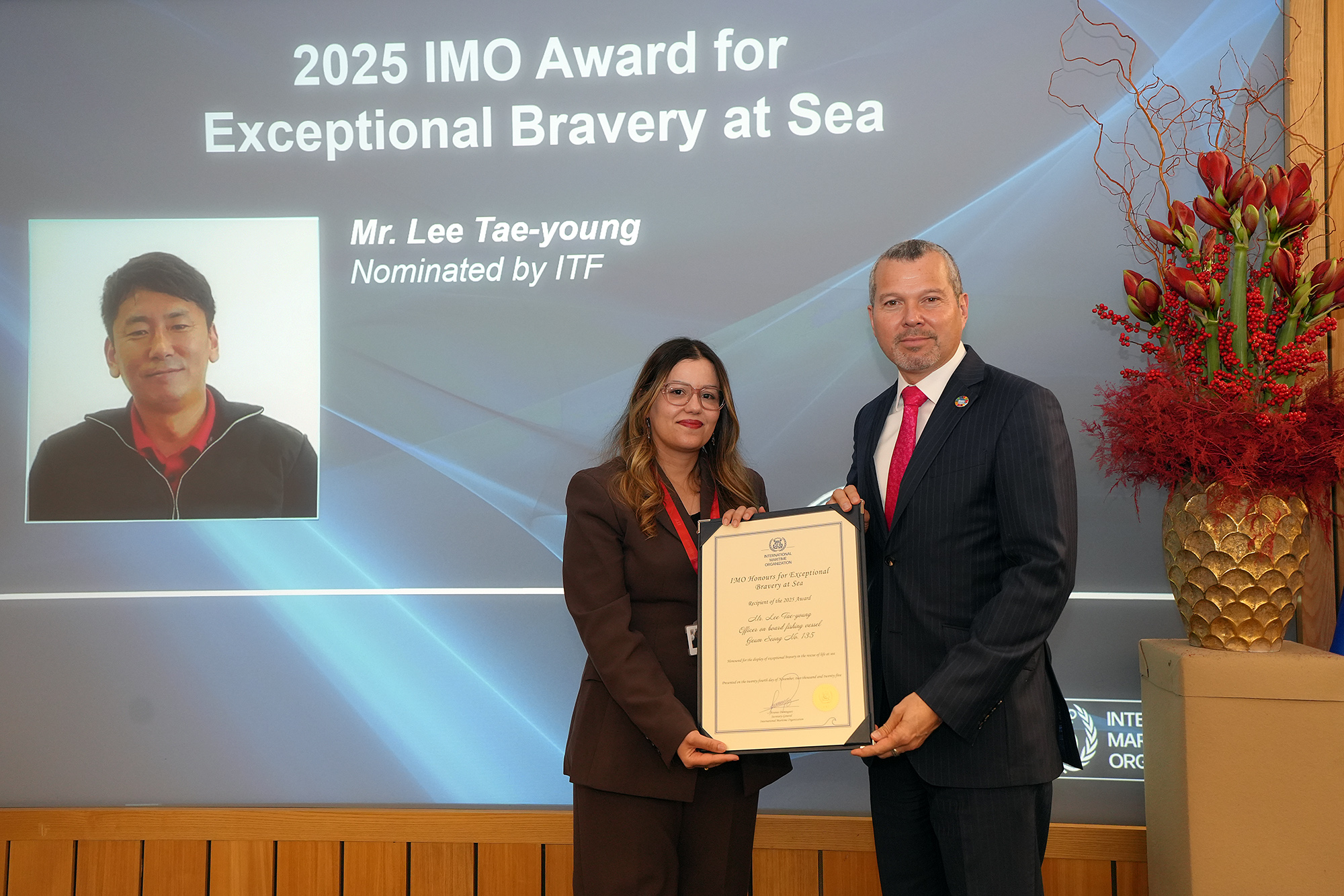 2025![]() El Sr. Lee Tae-young, oficial a bordo del buque pesquero Geum Seong No.135, nominado por la Federación Internacional de los Trabajadores del Transporte (ITF), recibió el Premio de la OMI 2025 al Valor Excepcional en el Mar Vídeo-Fotos-Rueda de prensa-Programa | |